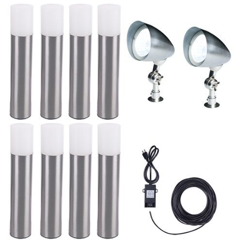 - Made out of stainless steel construction the set includes 8 Bollard landscape lights, 2 spotlights and a 10 watt transformer with a photo cell
