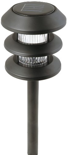 Metal 3-tiered path light with clear ribbed plastic lens, powered by the sun, no wiring required. High quality white LED never needs replacing. Rechargeable AA NiCd battery included.